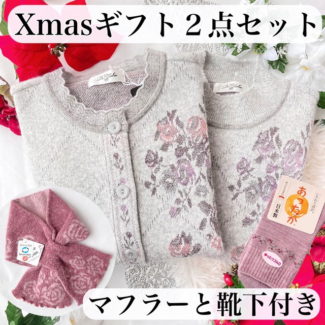 【Xmas限定!お得な2点セット(選べる3色)】花柄カーディガンと冬物カットソーのクリスマスギフト/70代・80代・90代ギフトSサイズ/日本製/小さめ高齢者服シニアファッション
