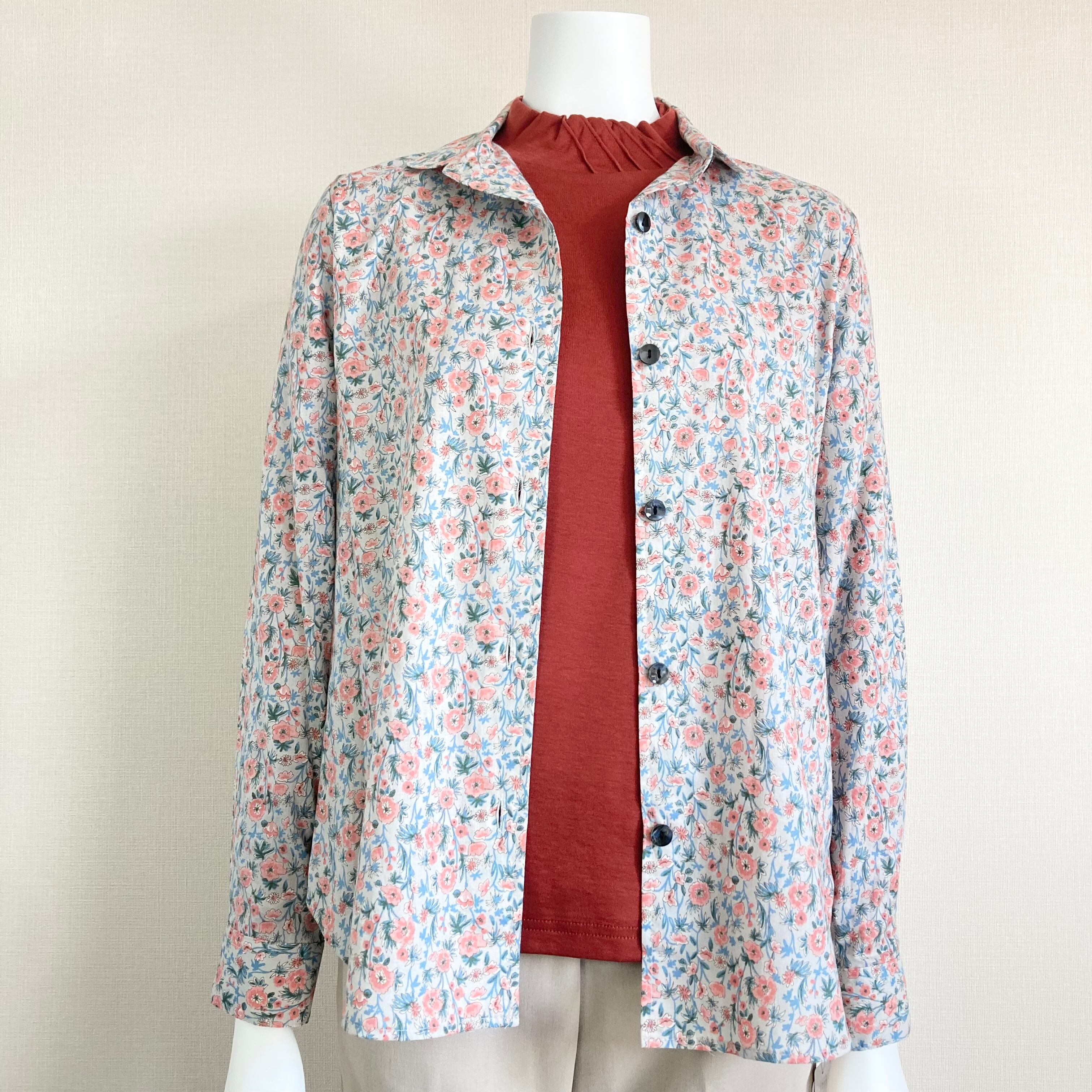小柄なご高齢の方に人気の小花柄。これ1枚でも、重ね着しても、色々と使えるスタンダードな形のブラウス