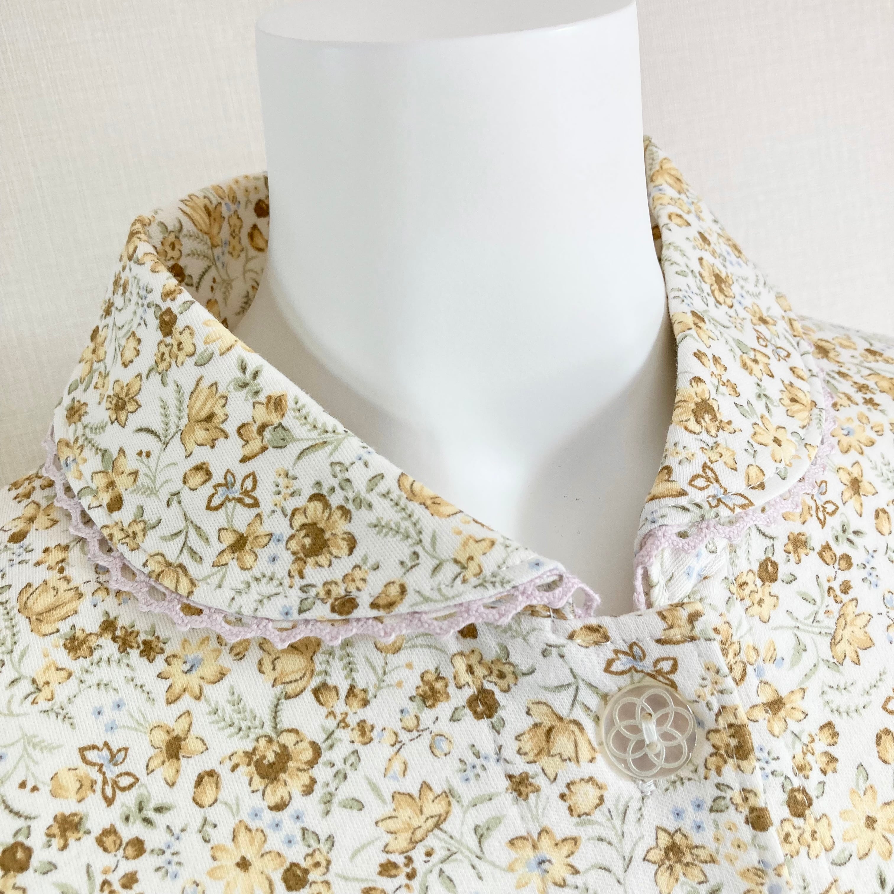 全体の優しい雰囲気の小花柄と、襟元のレースのテープがとっても可愛い!