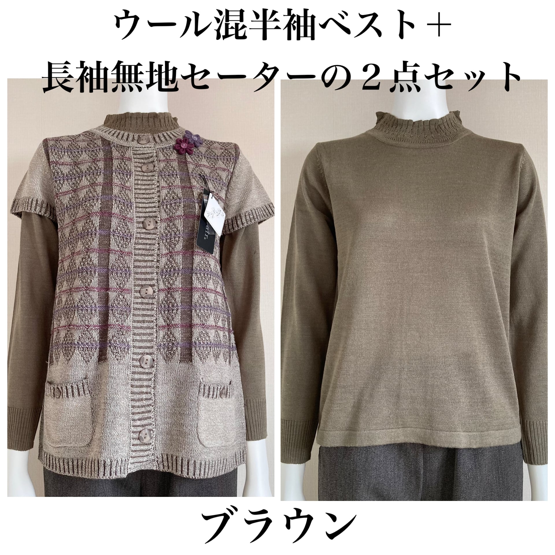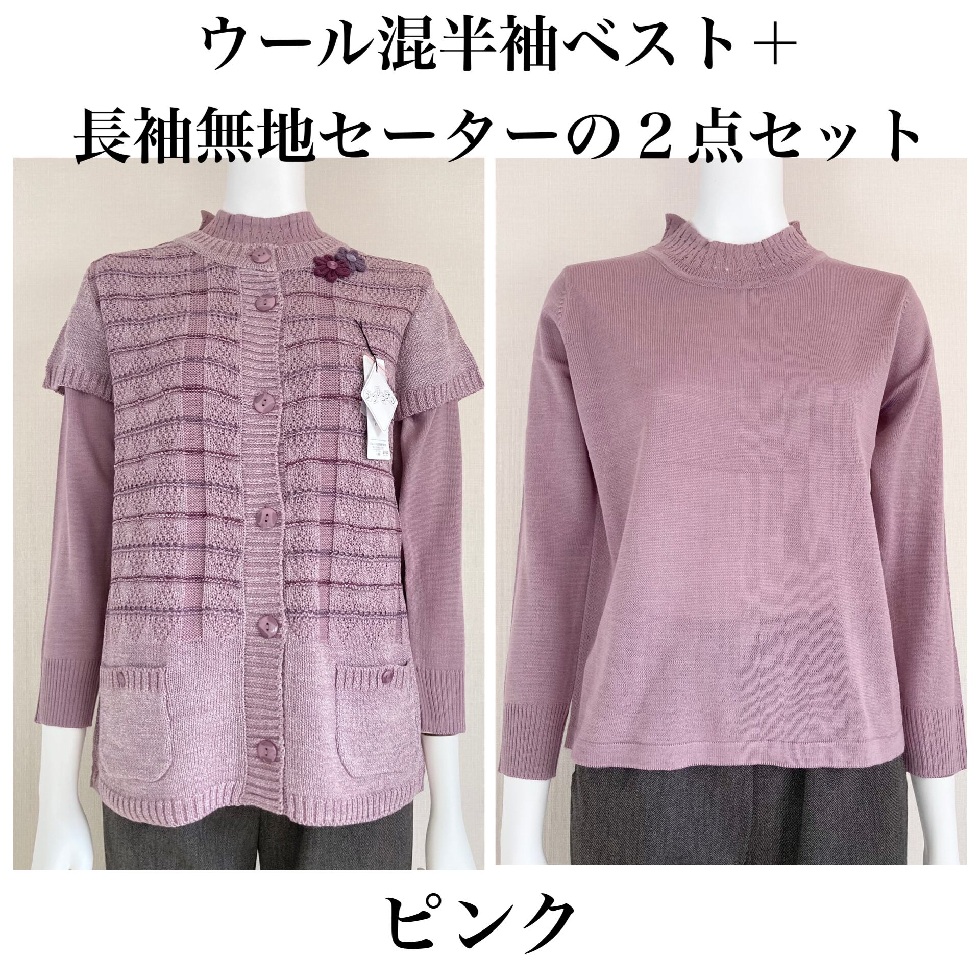 ウール混ベスト+長袖の無地セーター2点セット☆これだけでオシャレが決まりコーディネートが楽ちん♪