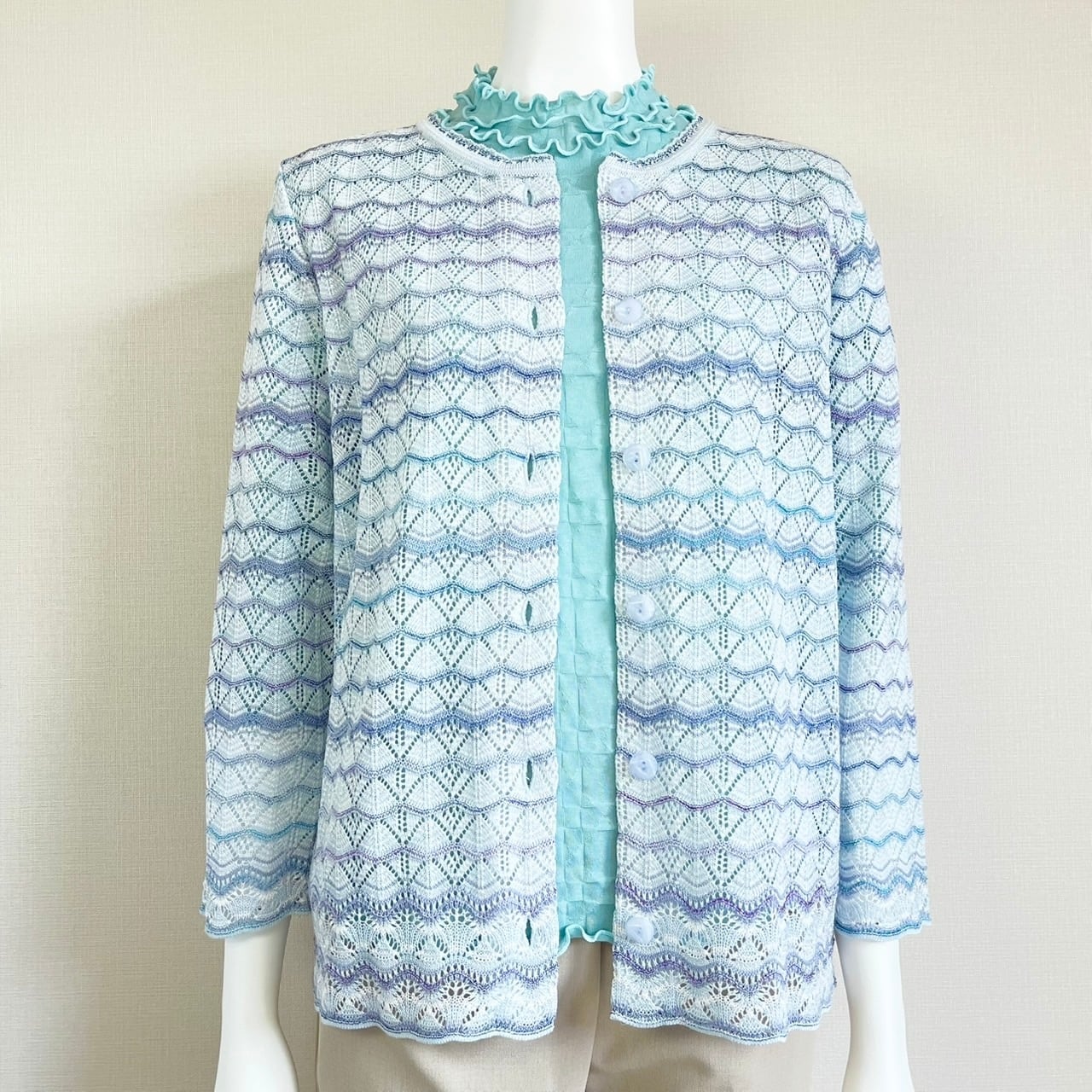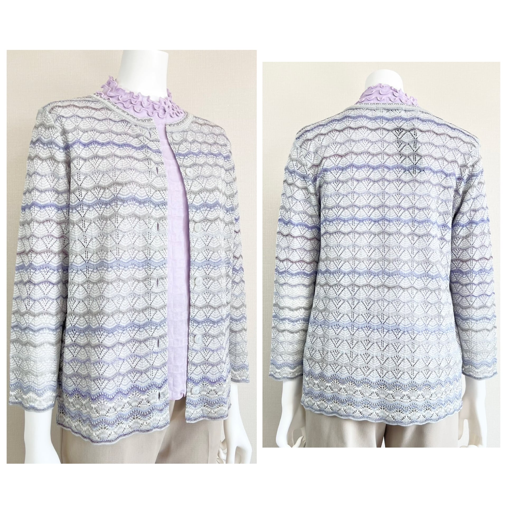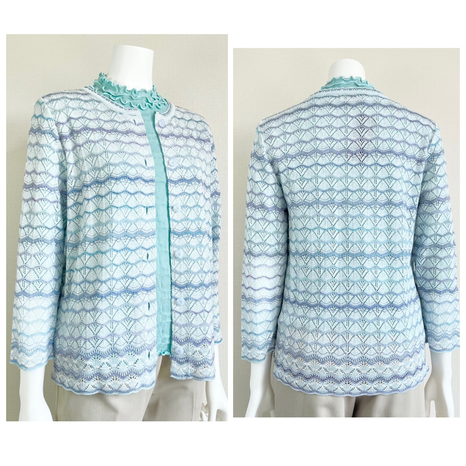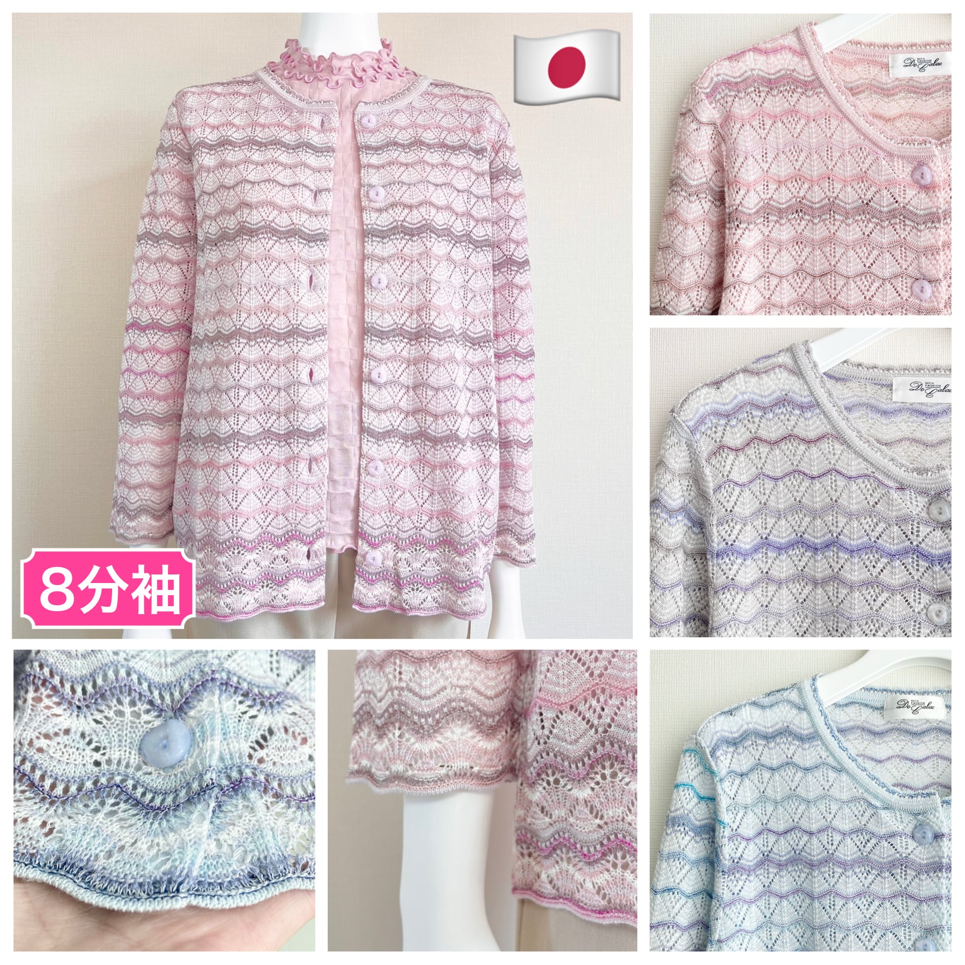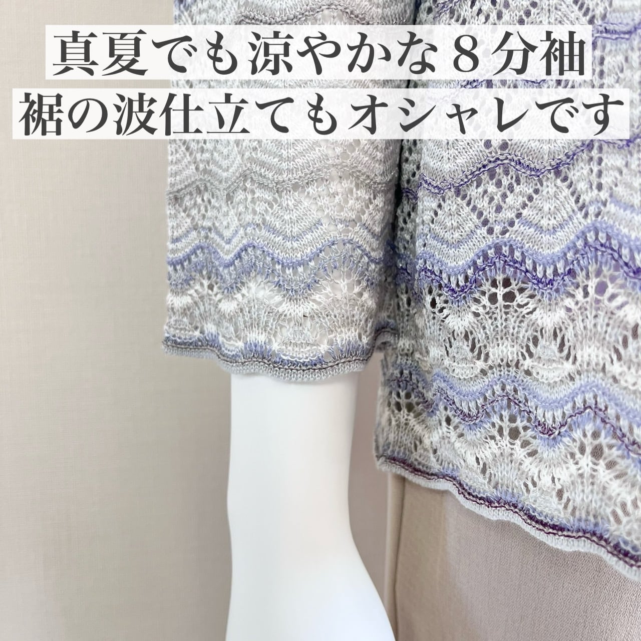 【初夏新作】8分袖の麻混☆グラデーションの波ボーダーが美しい!レース編みカーディガン/日本製/70代・80代・90代ギフト/小さめ/シニアファッション