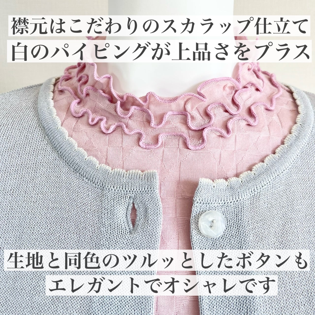 さらに襟元のさりげないスカラップのパイピング仕立てや、裾の波仕上げなど、繊細な仕事ぶりが秀逸で・・・!