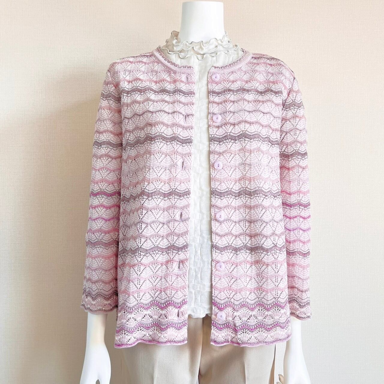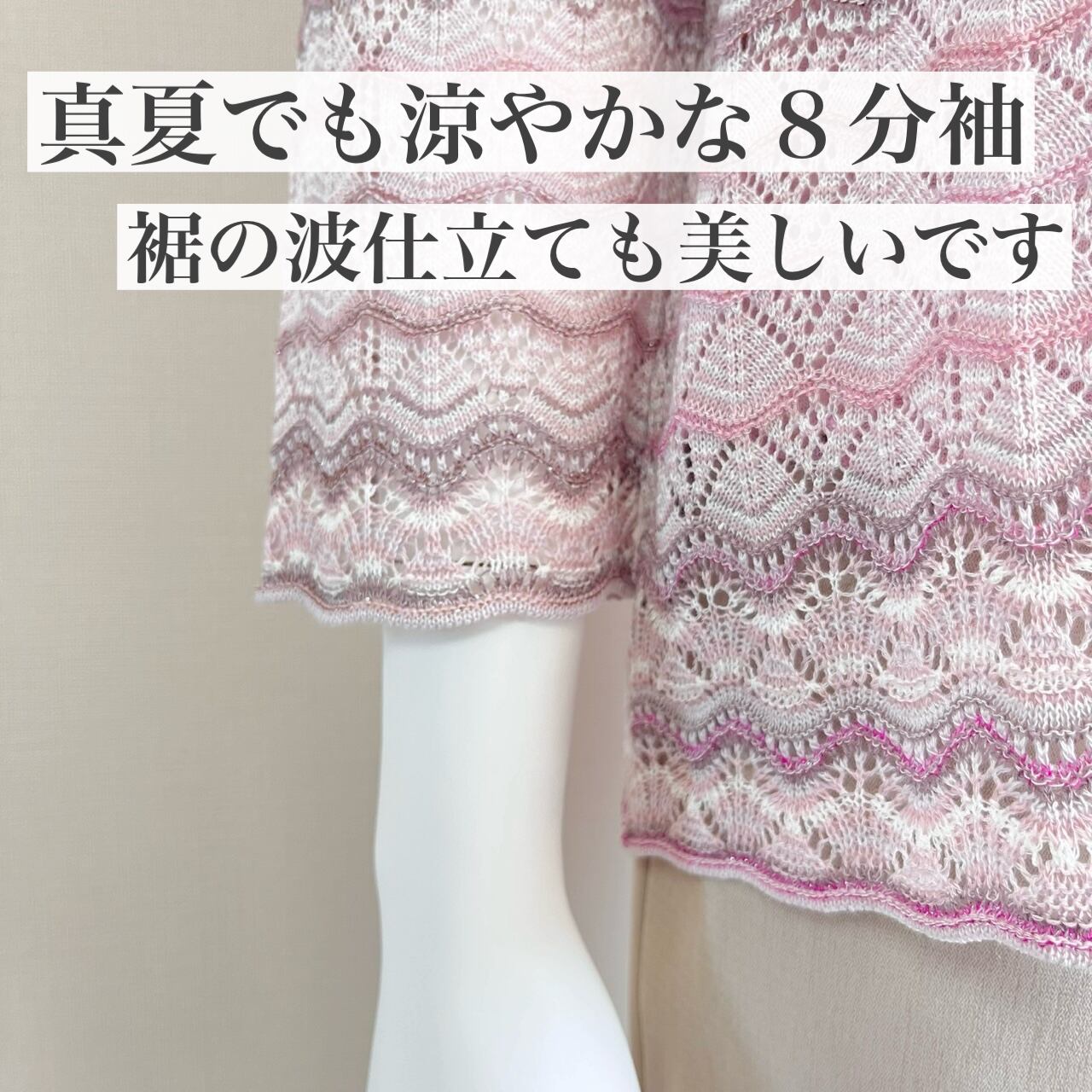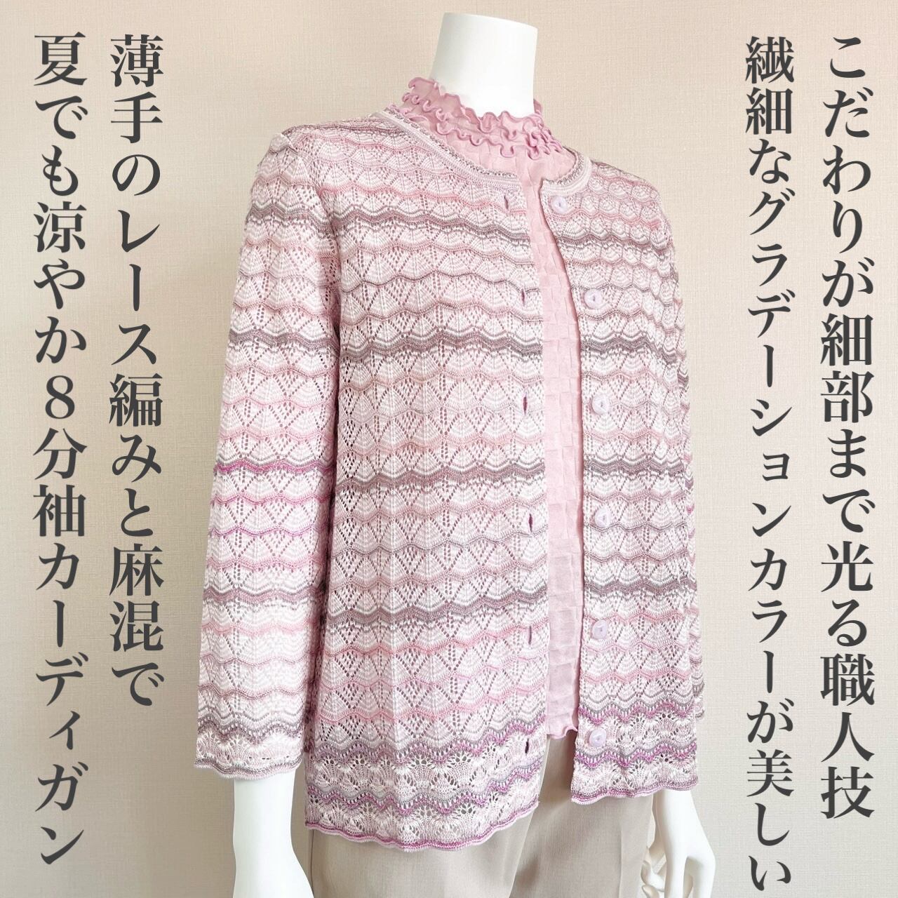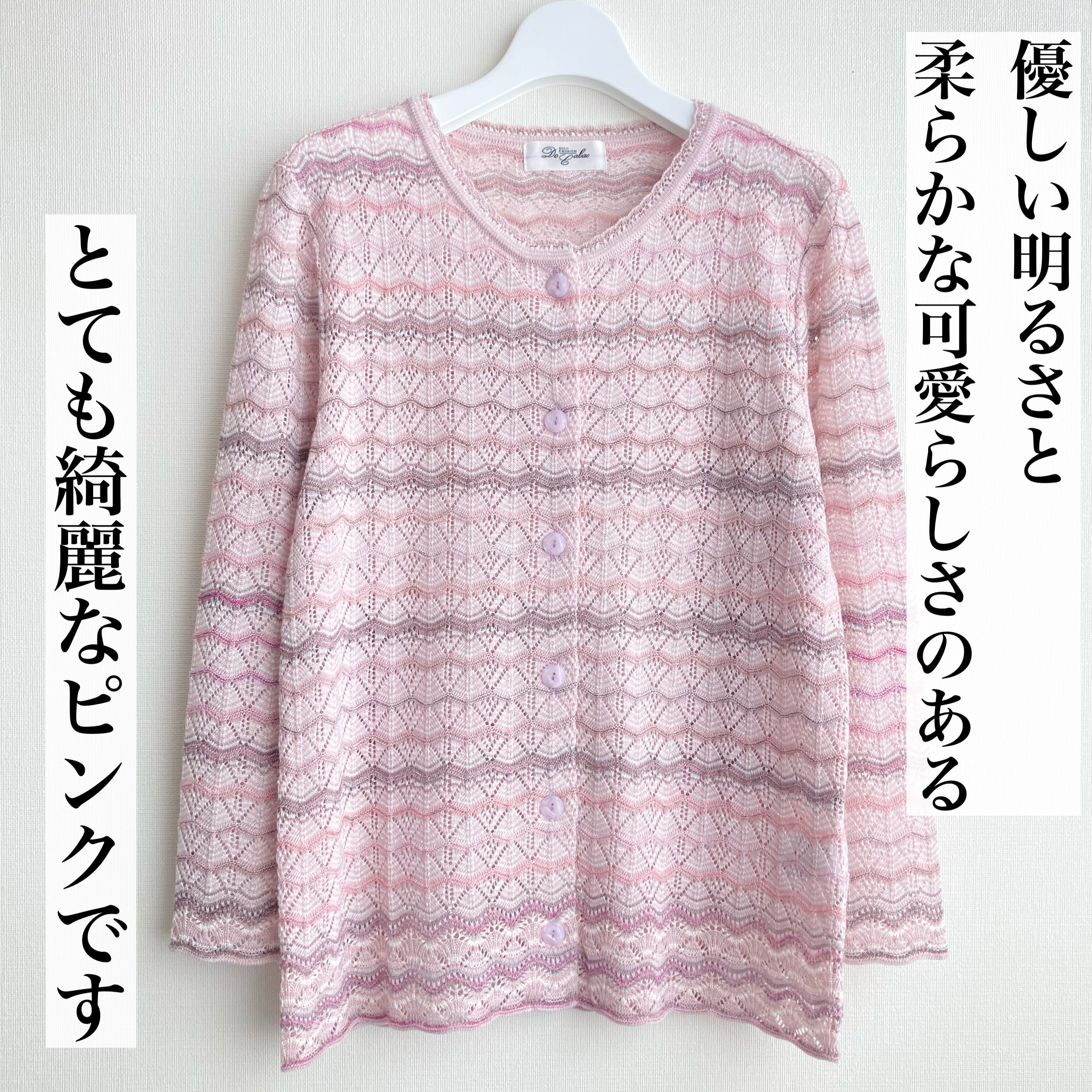 カーディガンは優しく綺麗なピンクを中心としたグラデーションカラー。