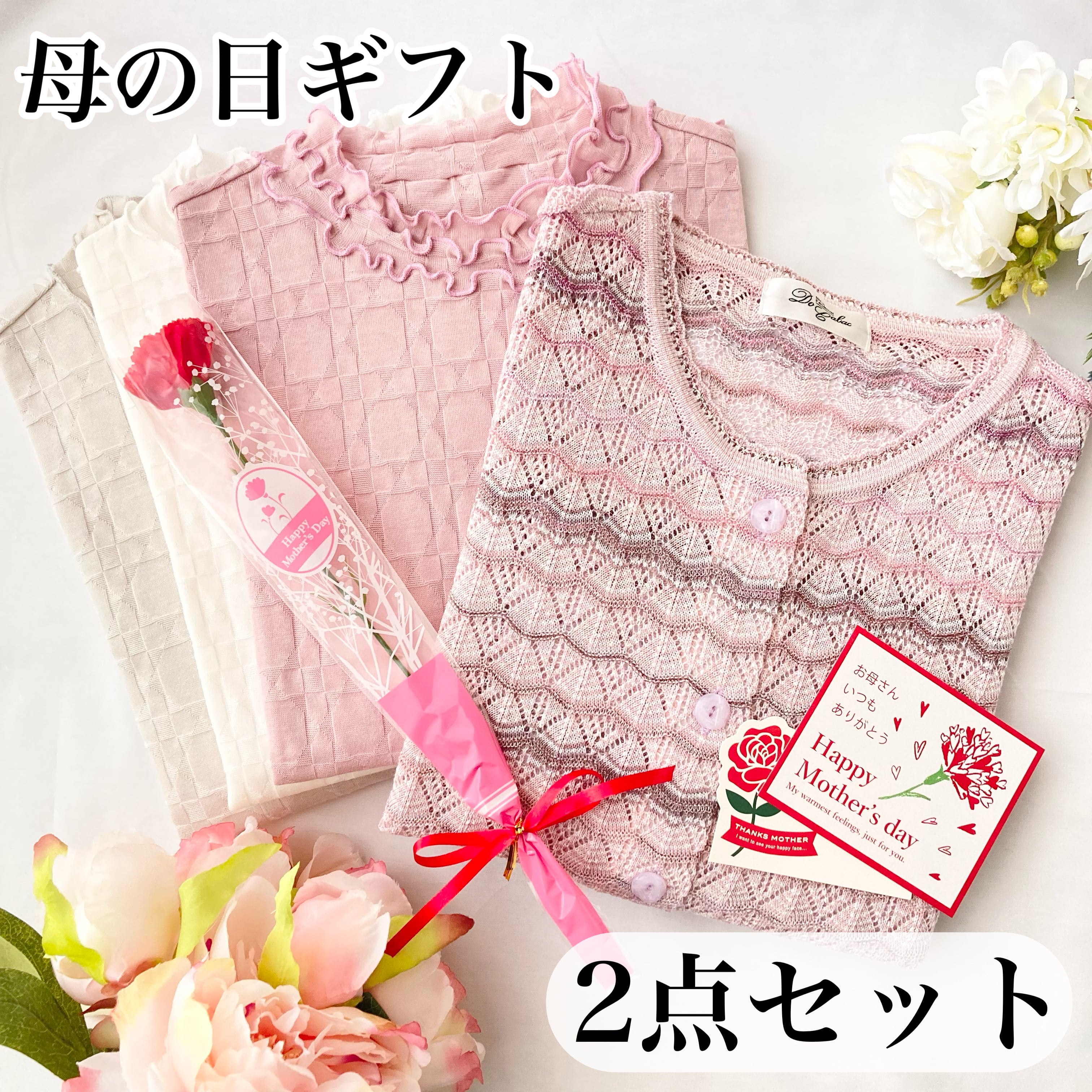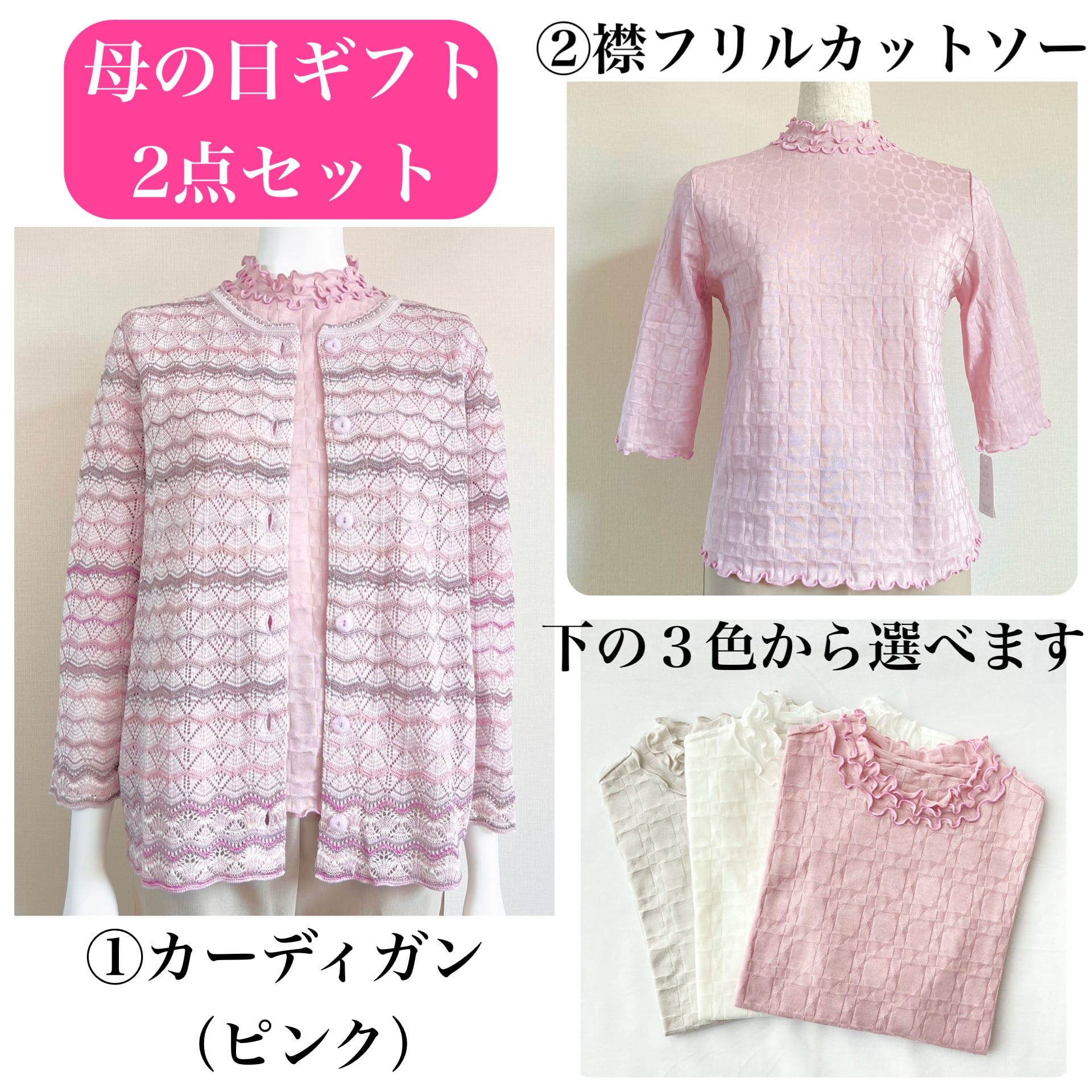 母の日ギフト限定のお得なセット☆カーディガン(ピンク)+襟フリルカットソー(選べる3色)の2点セット