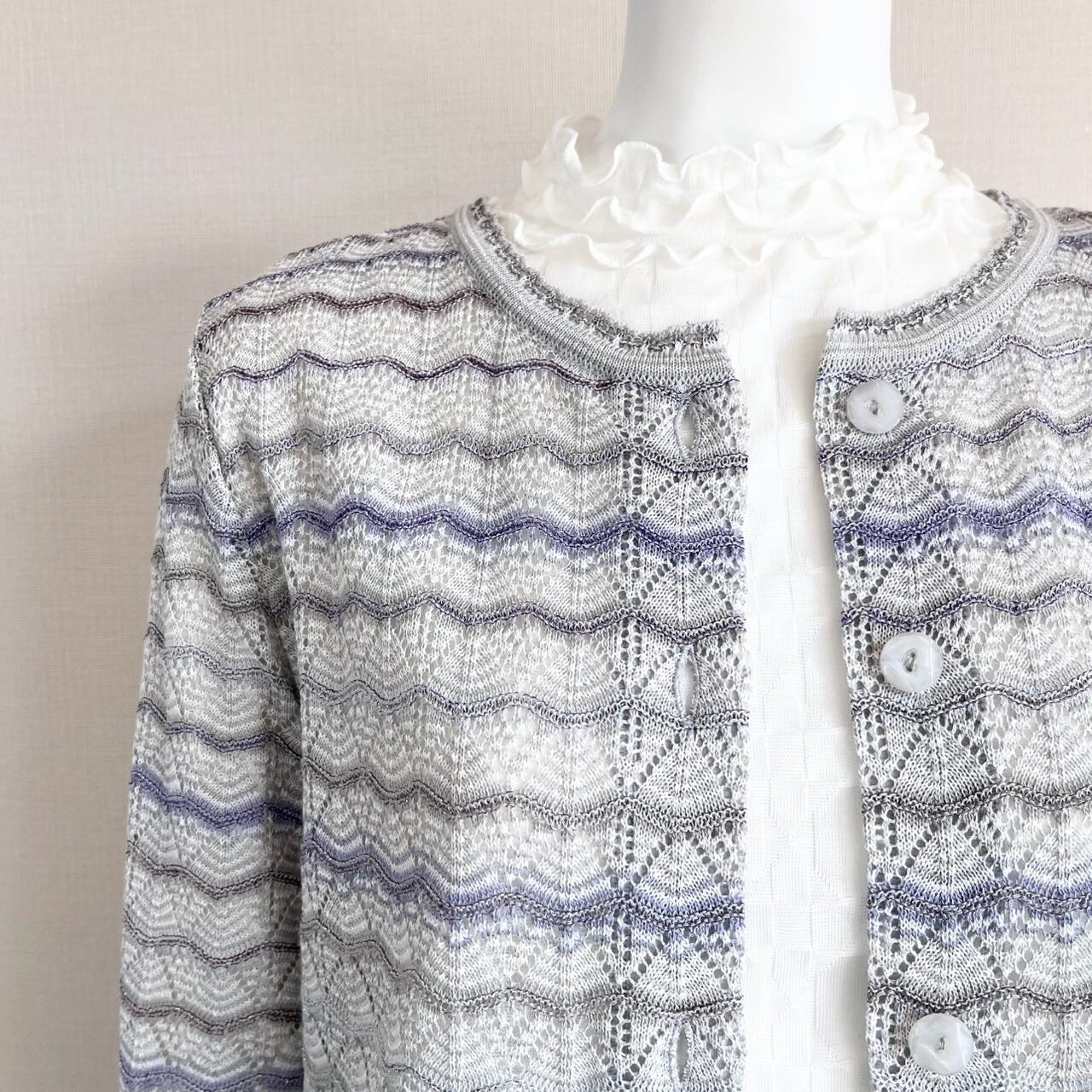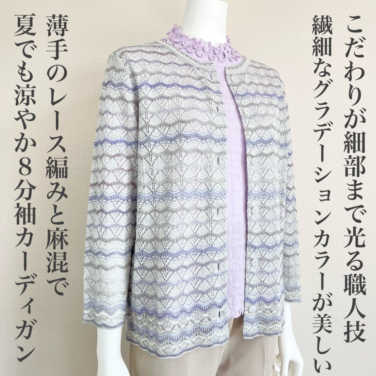 「繊細な波ボーダーのグラデーションカラーが美しい8分袖カーディガン」と、
