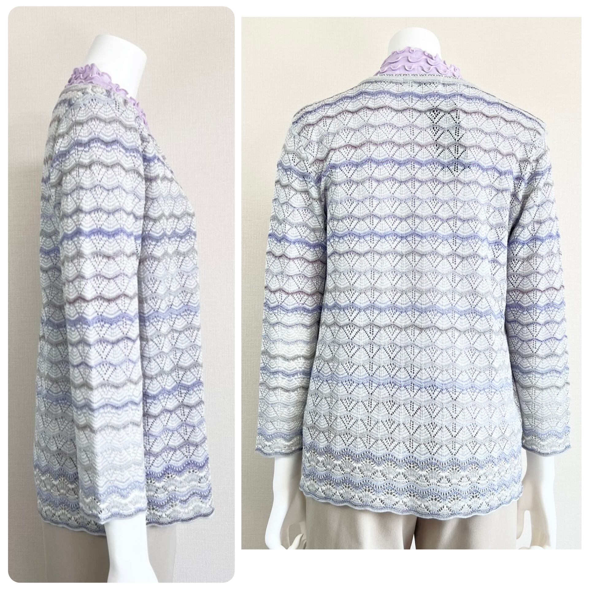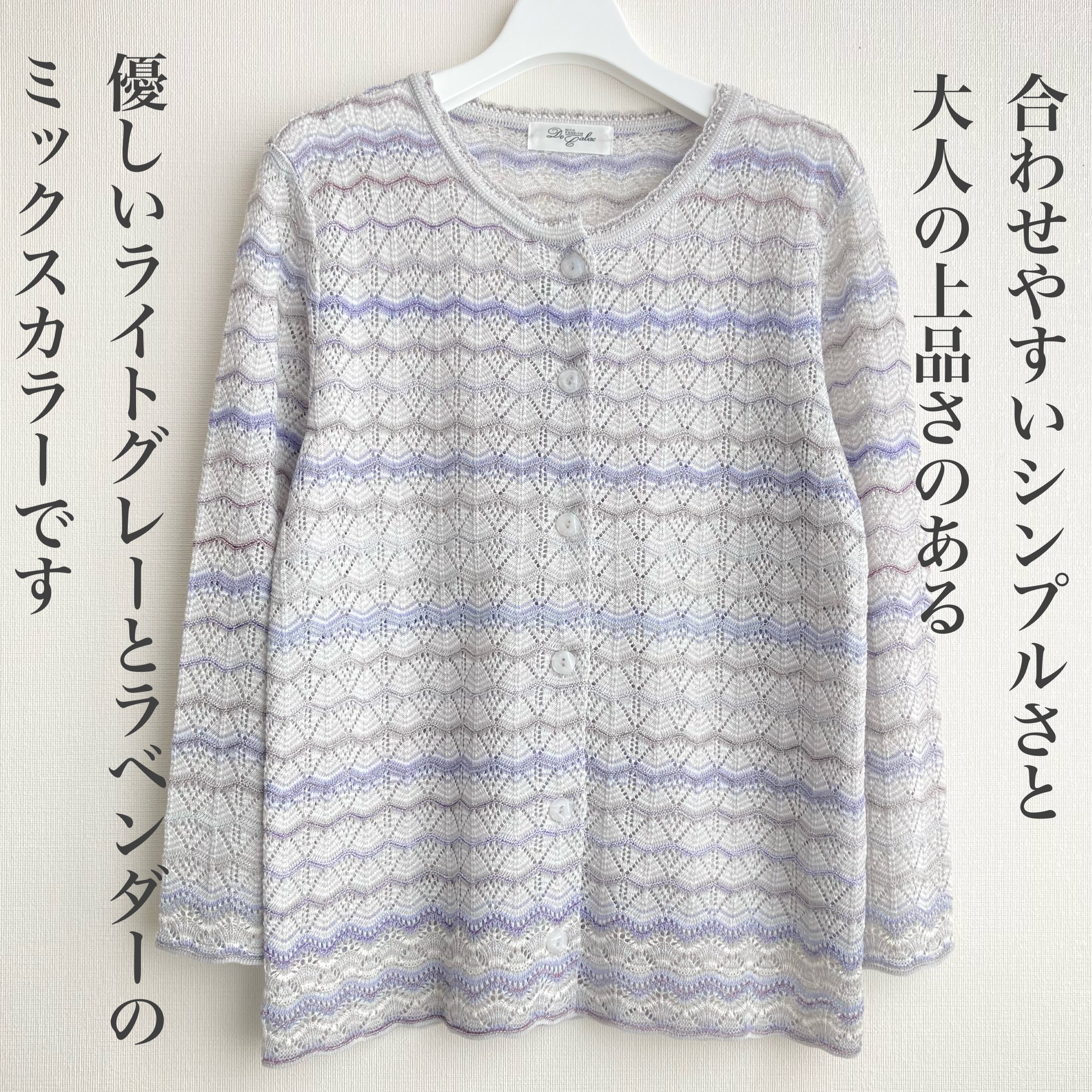 カーディガンは合わせやすいグレーにラベンダーをMIXしたグラデーションカラー。