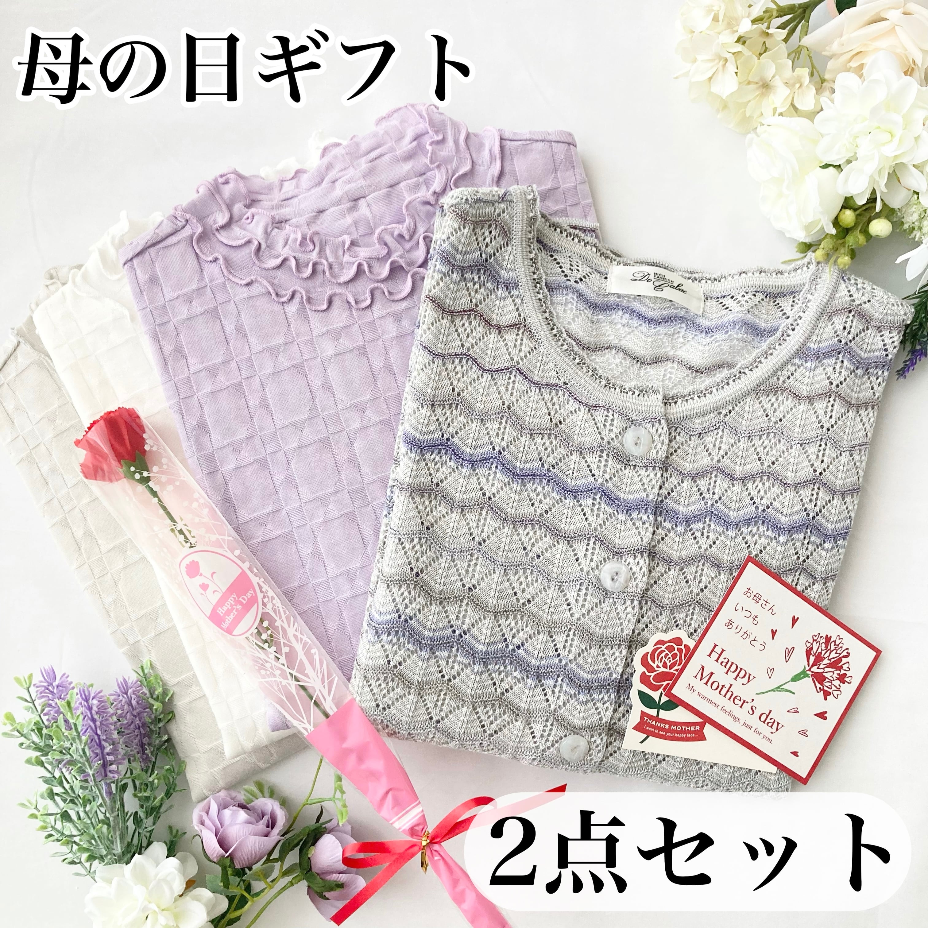 【母の日ギフト2点セット・グレー&ラベンダー】波ボーダーカーディガン&襟フリル6分袖カットソーの2点セット