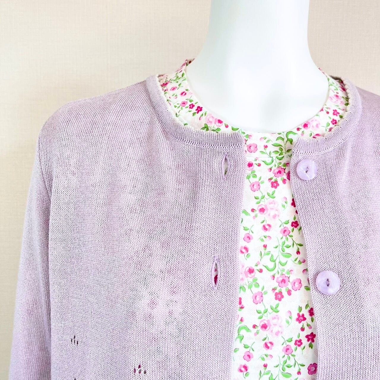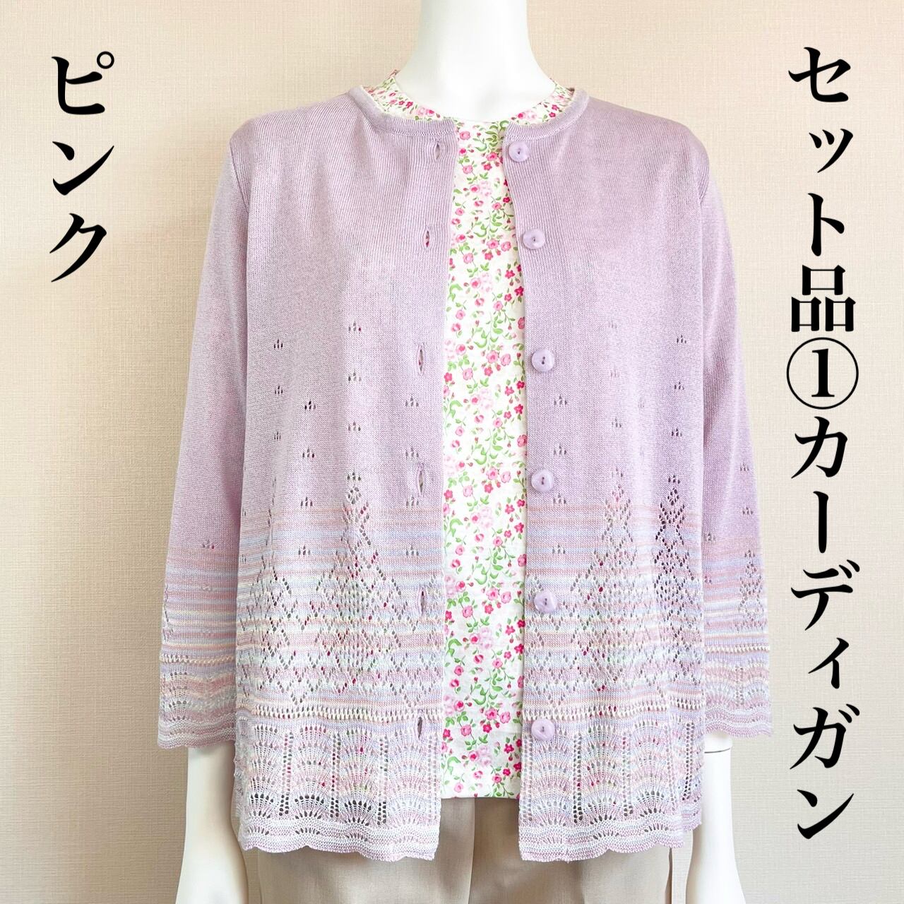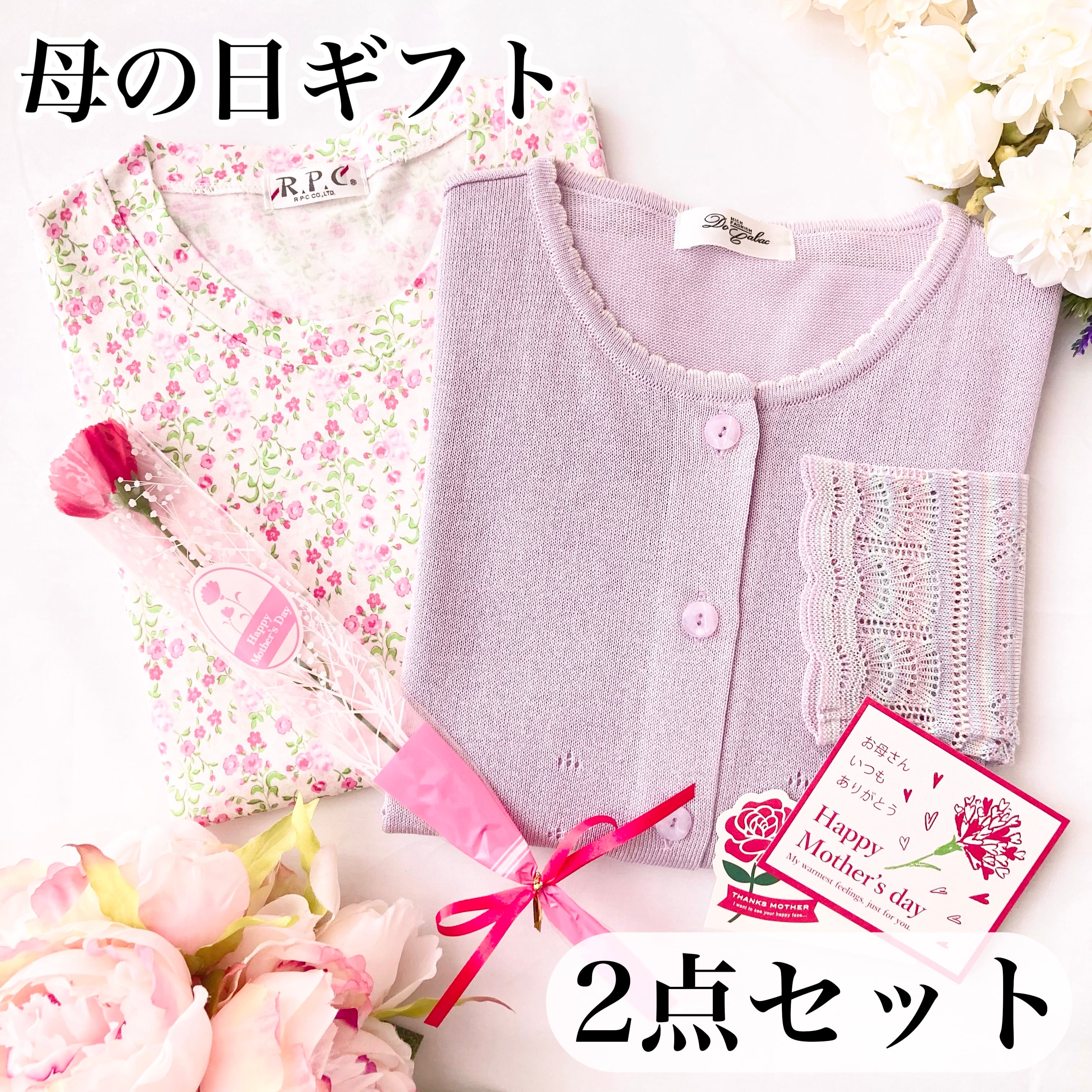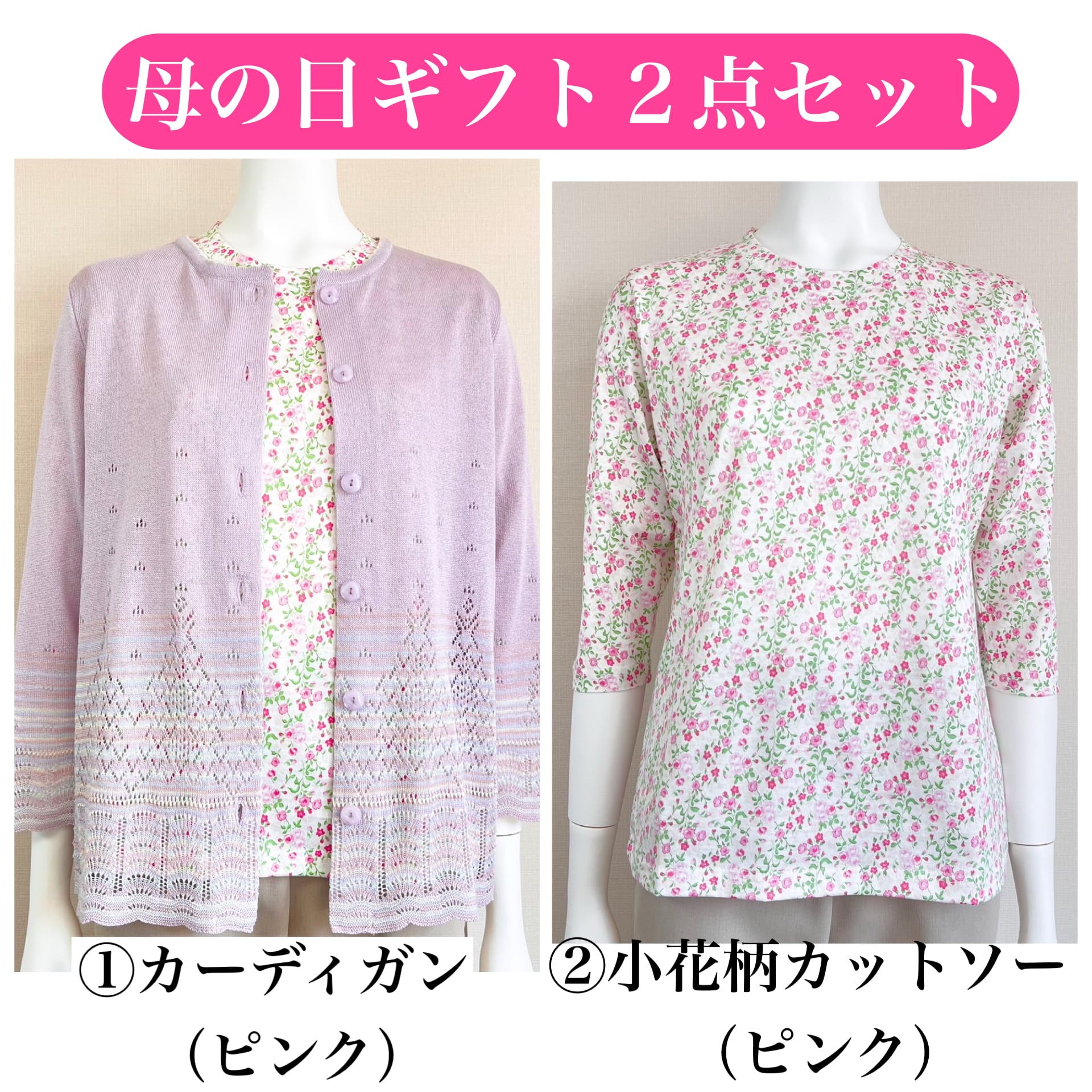 母の日ギフト限定のお得なセット☆カーディガン(ピンク)+小花柄7分袖カットソー(ピンク)の2点セット