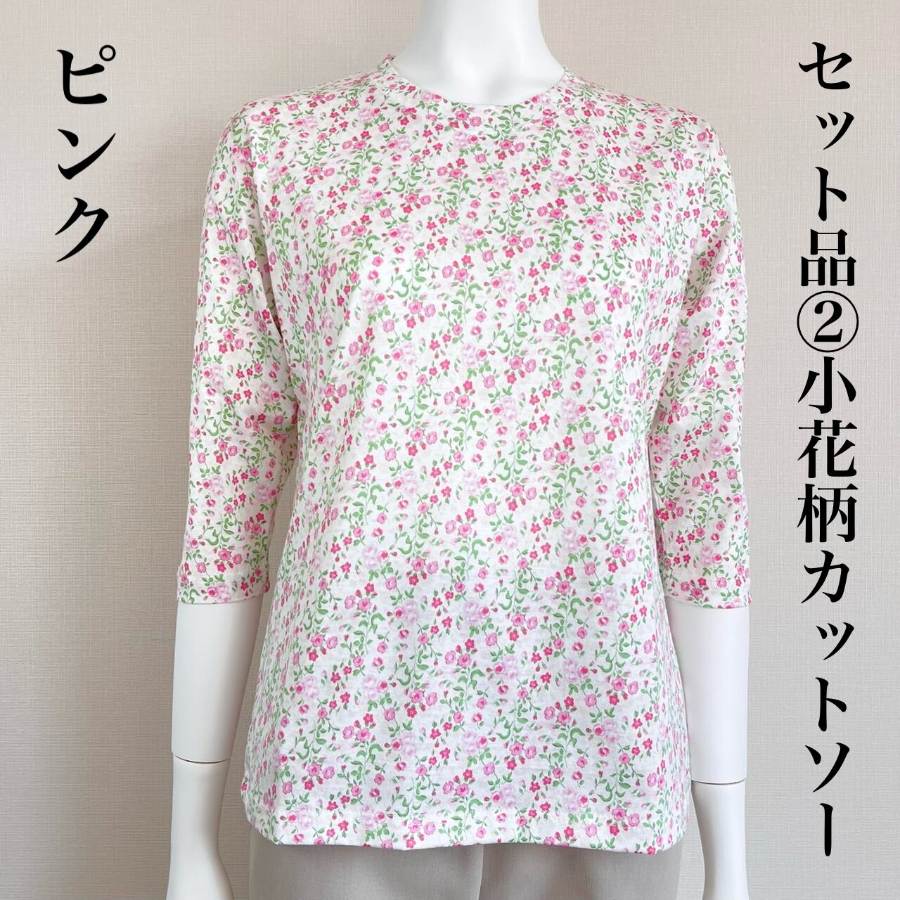 小花柄のピンク色カットソーをセットにしました。