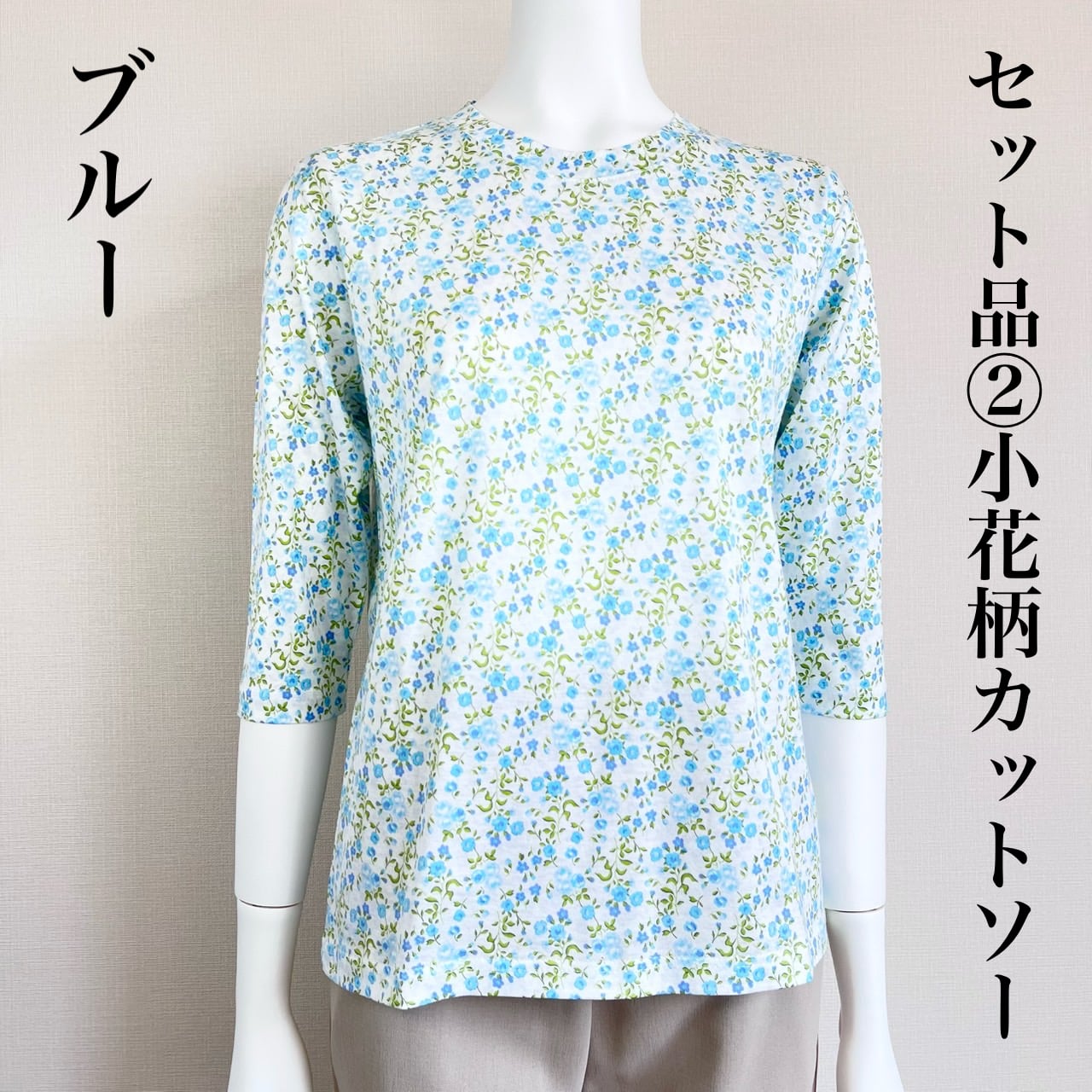 小花柄のブルー色カットソーをセットにしました。