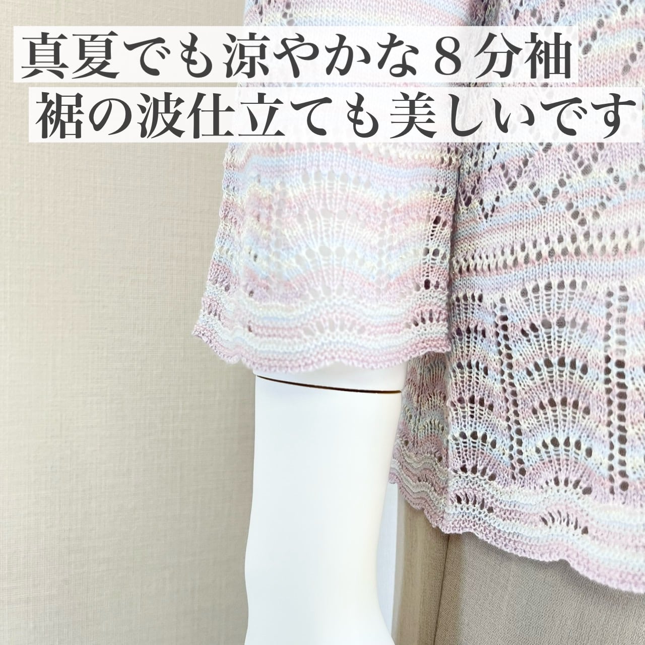 「無地で合わせやすく、かつ裾のさりげないボーダーが美しい8分袖カーディガン」と、