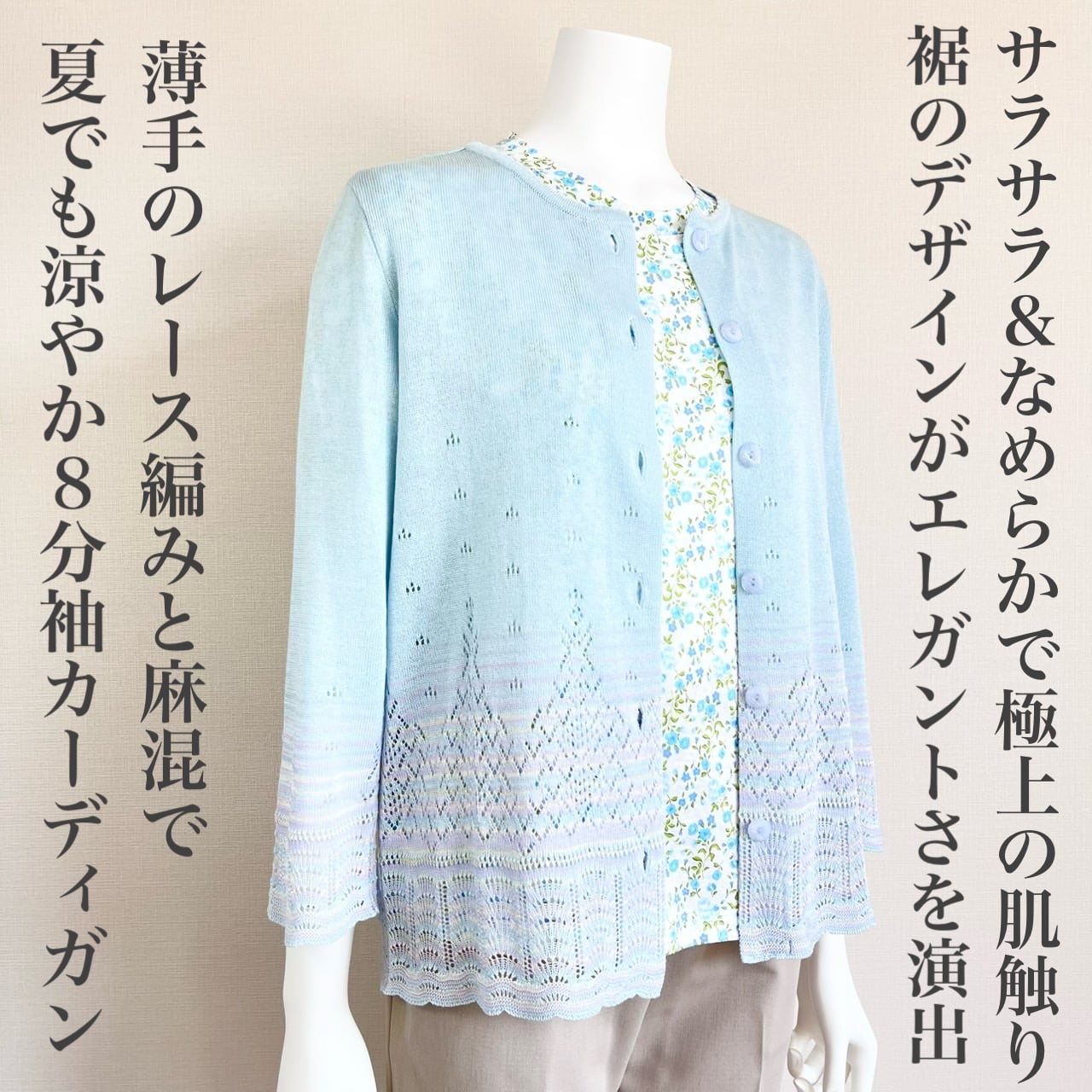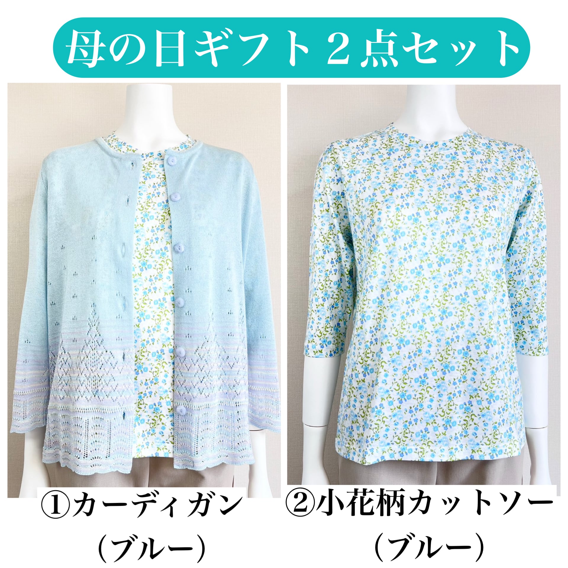 母の日ギフト限定のお得なセット☆カーディガン(ブルー)+小花柄7分袖カットソー(ブルー)の2点セット