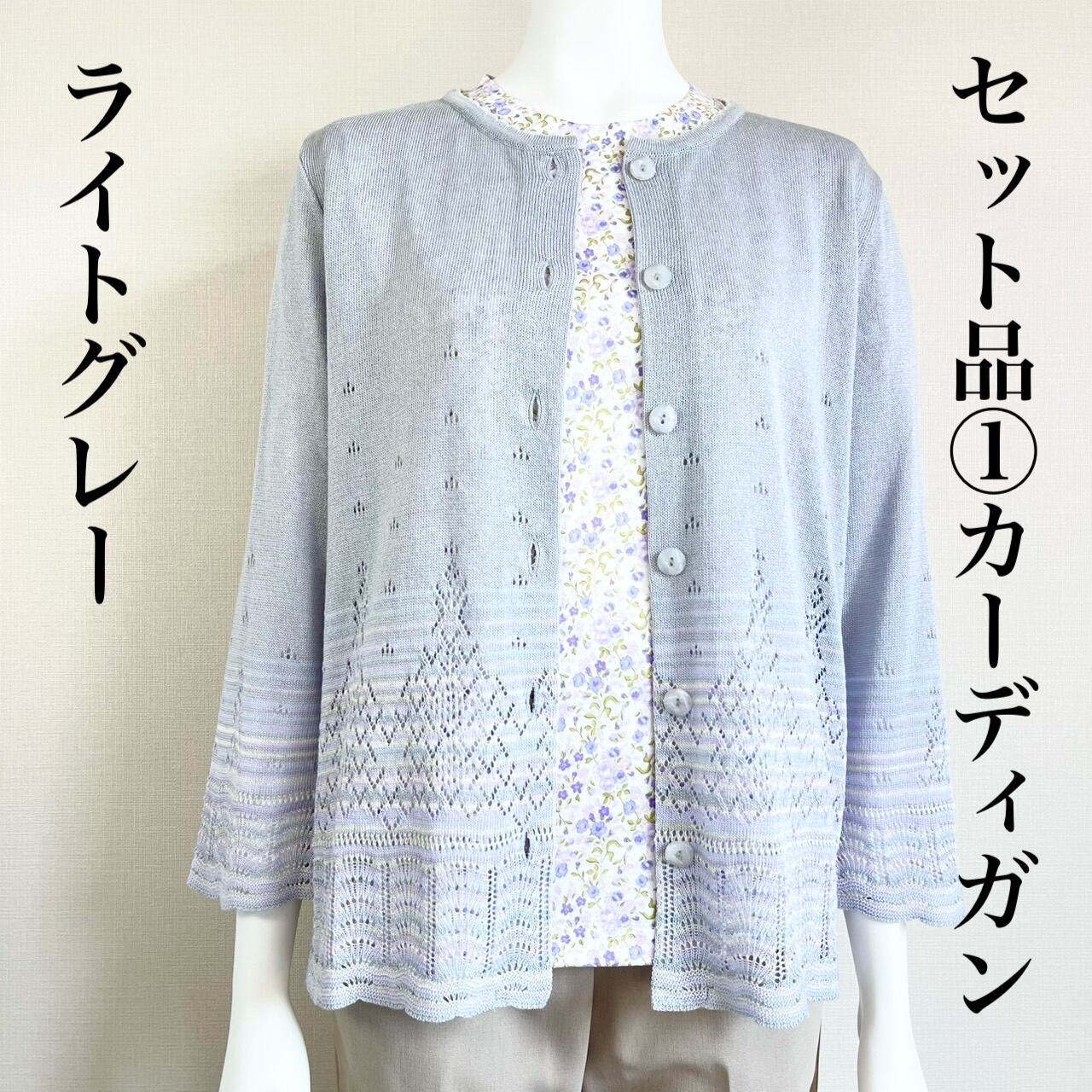 母の日ギフト限定お得なセット☆カーディガン(グレー)+小花柄7分袖カットソー(ラベンダー)2点セット