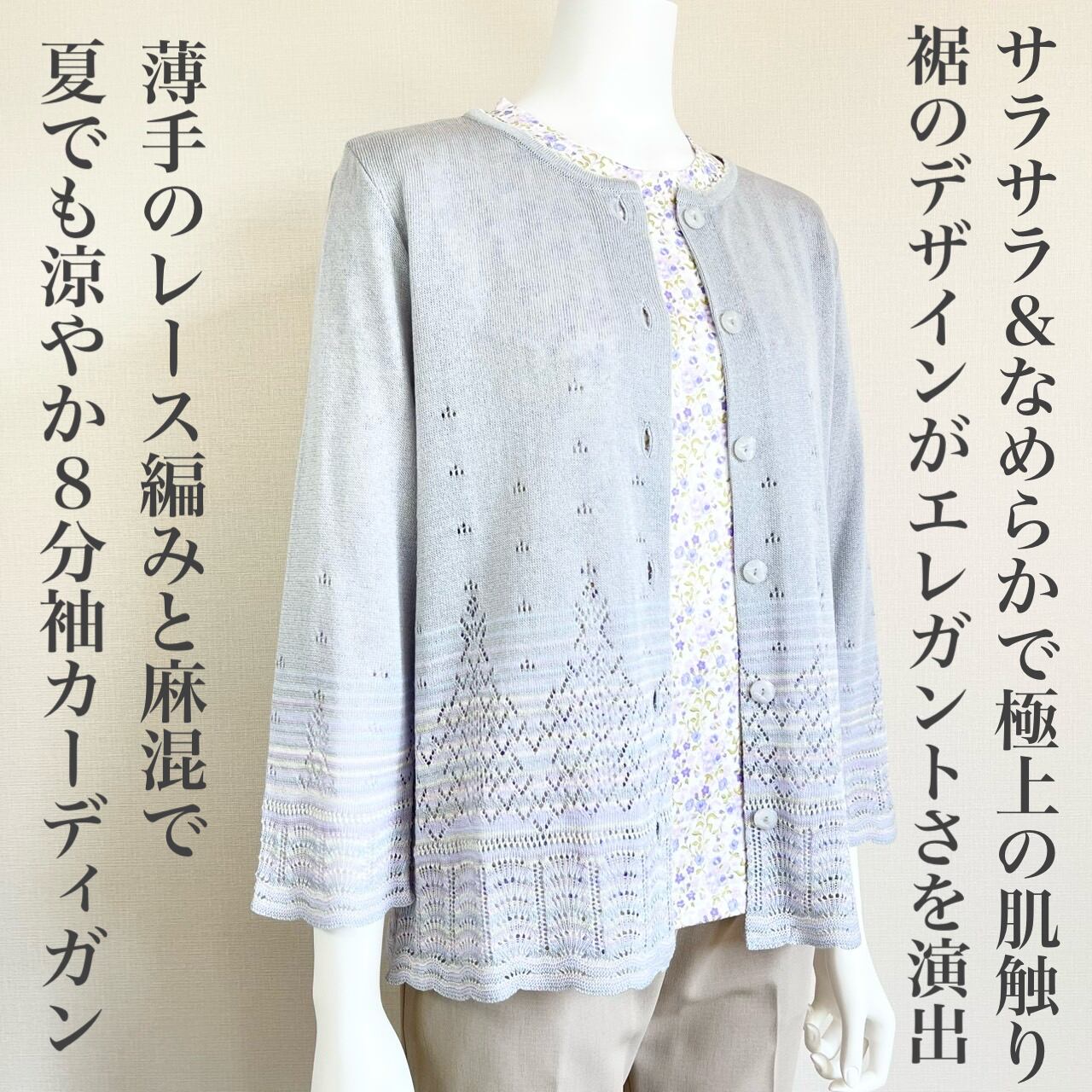 「無地で合わせやすく、かつ裾のさりげないボーダーが美しい8分袖カーディガン」と、