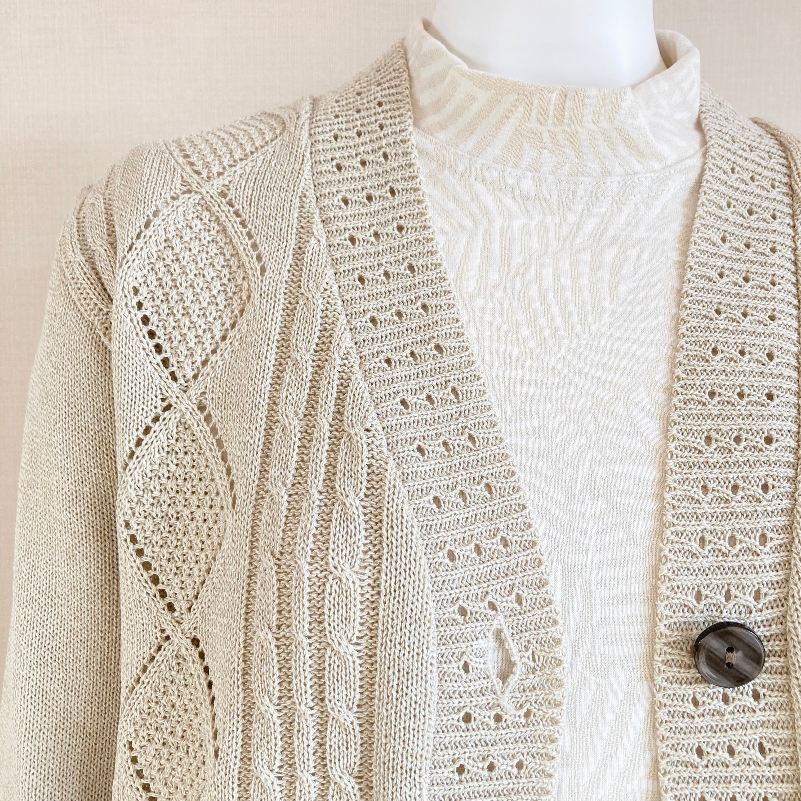 Vネックの襟元が若々しくオシャレ!初夏まで軽く羽織れるメッシュ編みカーディガン