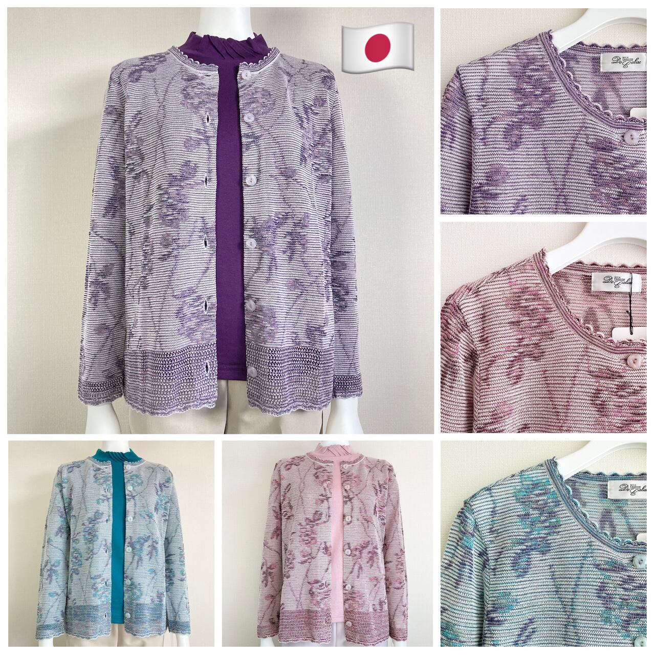 【春秋用】シックでエレガントなお花柄×レース編み!薄手で軽やかな麻混カーディガン/日本製/70代・80代・90代ギフト/小さめ/シニアファッション